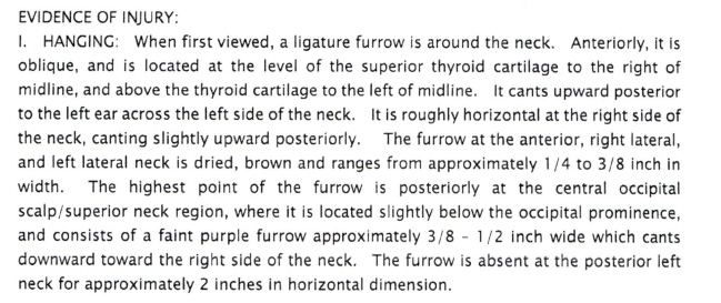 The pathologist could have been more clear by referring to the ligature furrow as an inverted “V” shape with the apex of the “V” at the Occipital protuberance and the arms of the “V” extending inferiorly, etc. This person failed the simplicity test.