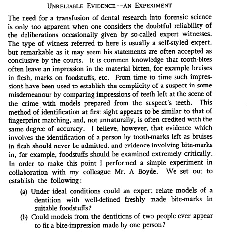 ………a British dentist said “bruises in human flesh” bitemarks were”unreliable evidence” and expressed reasons that were, 49 years later, used by the National Academy of Sciences in 2009 . He also said “usually a self-styled expert” and “so-called expert (s)” were involved in court deliberations touting their accuracy. Using those terms today, other than in your sleep, will get you sued or worse.
