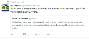 Max Houck (@maxmhouck) used to run the Washington DC Forensic Science facility which then boasted as being “independent” a la Houston’s Forensic Science Center. Above is his Twitter response to and post about police managers refusing an open and transparent scientific disclosure of their methods and results. During Houck’s tenure at the DFS , access to forensic results and methods was non-confrontational (e;g; not limited to prosecutors). Since then, after his having been dismissed/resigned, the doors have been shut tight by the DC mayor and District Attorney’s new appointee, an ex-FBI lab manager. This raises barriers to fair justice as this type of forensic lab “protectionism” is akin to police body-camera non-disclosures or deletions. Most recent examples in Chicago and North Carolina.
