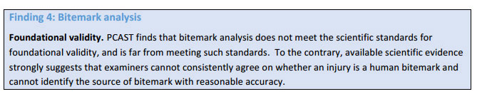 An unofficial and possibly “leaked” unpublished draft from the White House Science and Technology Council (#PCAST) has arrived via the Internet. It is a new and comprehensive forensics review by a PCAST Working Group and tells a tale about the ABFO’s bitemark bunch. Their conclusions are clearly expressed. The draft has yet to be approved by the entire Council. Their rationale is based on: