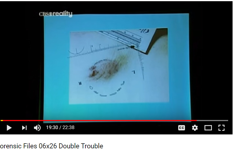 Note: the above courtroom image shows a bitemarker’s analyzing a ‘positive identification’ with ‘reasonable medical certainty.’ All based on a few normal teeth. The District Attorney said the “match” was “dramatic.”